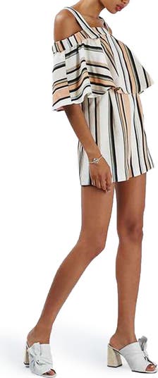 A flouncy popover bodice adds playful movement to this colorfully striped romper cut with on-trend cold-shoulder sleeves.