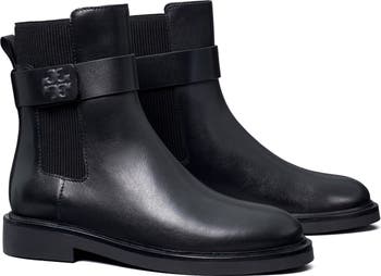 An embossed logo adds a subtle signature flourish to a classic Chelsea boot shaped from smooth leather.