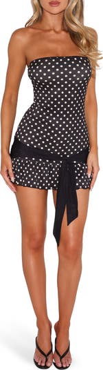 A monochrome polka dot print furthers the cute retro-inspired vibe of a sleeveless body-con minidress with a scalloped neckline, ruffled skirt and decorative tie cinching the waist.