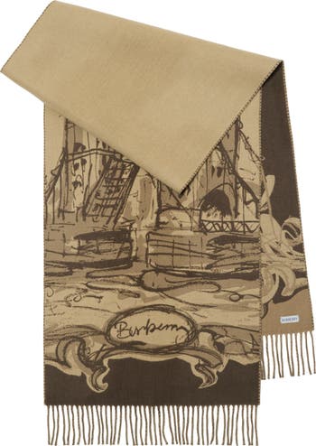 A scarf made in Italy from cashmere, washed for a soft finish. The design is jacquard-woven with artwork depicting London’s Tower Bridge, Union Jack flags and the horse from our Equestrian Knight Design.||Rectangular|Fringing at both ends|Jacquard-woven Burberry lettering