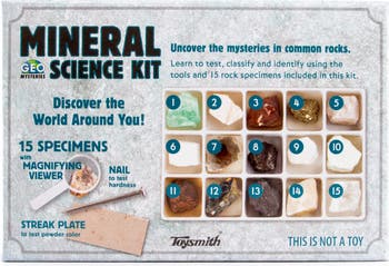 Explore the secrets of everyday minerals with the Toysmith Mineral Science Kit. This kit educates on how to examine, categorize, and recognize various minerals. It comes with fifteen mineral samples, a magnifying viewer, and a useful identification guide. Ideal for budding science fans, particularly those fascinated by geology. The included plastic storage tray ensures the mineral set remains organized when not in use. Suitable for children aged 8 and older.