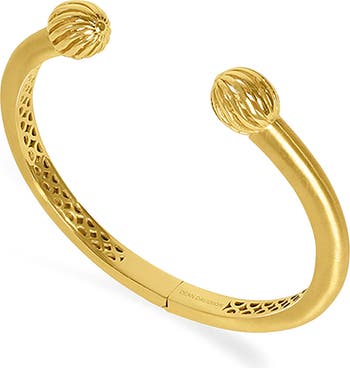 Cage-like beads punctuate the ends of this statement-making cuff bracelet with sculptural movement.