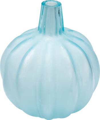 This transparent light blue glass candle holder adds a touch of seasonal charm with its pumpkin-inspired design. Sized to fit tea lights, votives, or pillar candles up to 3 inches in diameter, it’s as versatile as it is decorative. The open stem not only enhances the whimsical look but also allows for proper ventilation during use. Ideal for autumn accents, festive centerpieces, or cozy year-round lighting Product Features: Open "stem" for ventilation Fits tea light, votive, or a pillar candle up to 3" in diameter (not included) Recommended for indoor or covered outdoor use Dimensions: 9" high x 6.5" diameter Material(s): glass