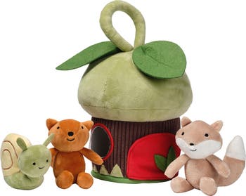 This unique plush treehouse set is a little home for big adventures featuring the cutest trio of forest friends. There is a sly fox, adorable squirrel, and a cute snail all with embroidered faces. Designed for tiny hands, this soft and cuddly playset is the perfect way to spark your child’s imagination and fine motor skills. The charming treehouse is 10.5 inches tall including the handle. The round top is made in soft velour and the bottom is a textured ribbed velour. There are green leaves at the top along with a handle for carrying on the go. Two round windows with red embroidery and one arched door made in red velour opens and closes with a hook and loop fabric strip. There are additional appliqued decorations around the bottom of the treehouse. Children can play hide and seek by putting the characters in and out of the numerous openings as they learn about object permanence.