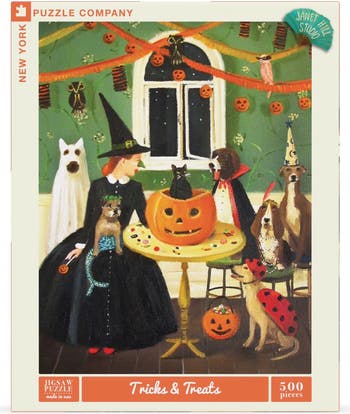 Happy Halloween! This festive scene captures Miss Moon at a Halloween house party where her dogs in costume steal the show, and a surprise guest—a black cat popping out of a jack-o-lantern —adds an extra layer of "how did I get here?" With its vibrant details and charmingly spooky atmosphere, this puzzle 500 piece puzzle, "Tricks Treats" by the talented Janet Hill promises a delightful challenge for all ages.\r\n\r\nFrom Wise Words From A Dog Governess by Janet Hill
