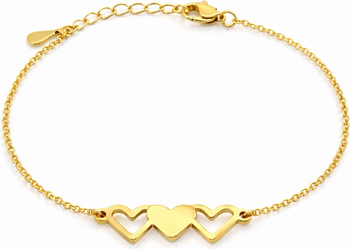 Elevate your wrist with this sophisticated triple heart chain bracelet, crafted in warm brass with a lustrous gold tone finish. The delicate design features three interlocking hearts that catch the light beautifully, creating an understated yet meaningful statement piece. Measuring 7 inches with a convenient 2-inch extender, this bracelet adapts to your perfect fit. Secured by a reliable lobster clasp, it combines timeless elegance with everyday wearability. An ideal gift for someone special or a refined addition to your own jewelry collection.