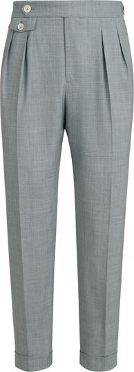- Zip closure with button, metal hook and backing buttonSlanted front pockets with watch pocketDouble pleatBuckles on the sideBack welt pockets with buttonCupro lining to kneeCuffed hem