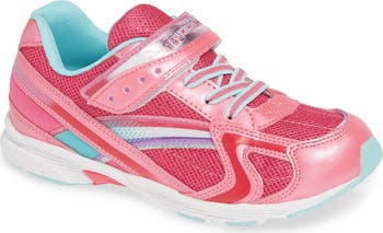 Rainbow racing stripes curve up the sides of a brightly colored, machine-washable sneaker designed with a lightweight, barefoot feel. Elastic laces and a hook-and-loop bridge strap make it easy to put on and take off, while a sturdy heel cup and a grippy rubber tread provide stability and traction in any activity.