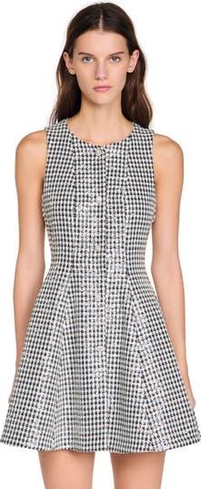 Sleeveless short sequinned tweed dress, fitted at the waist and flared at the bottom, with a round neck and decorative jewel button fastening.