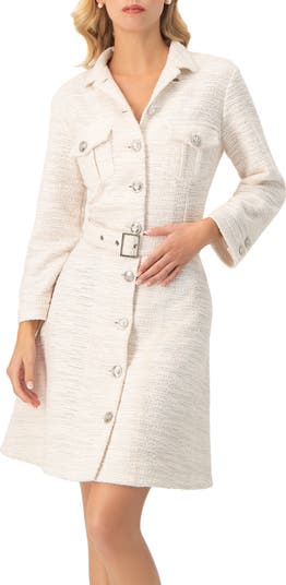 Midi Tweed dress featuring front buttons, long sleeves, and a belt.