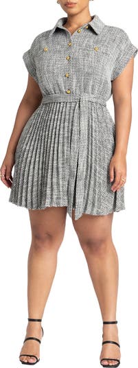 A tweed mini shirt dress with pleated skirt and impeccable lining.