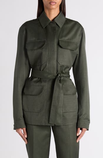 Resort-ready style takes a utilitarian path with this safari-inspired belted jacket impeccably sewn from cotton-rich twill detailed with tonal topstitching.