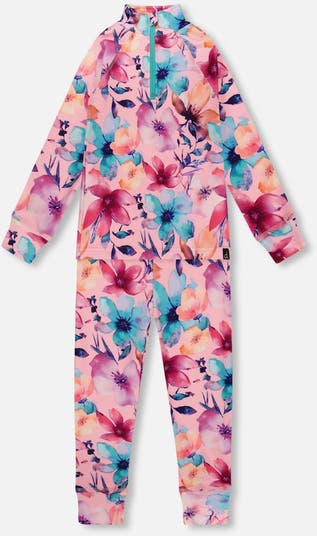 Designed to provide increased warmth and excellent range of motion beneath a snowsuit, these base layers are essential for skiing, snowboarding, and other cold weather sports. This two-piece thermal underwear set is made from thick brushed jersey with a super soft finish and ultra-comfortable feel. With an allover pink watercolor flower print, this set includes a long raglan sleeve top with a half zip neckline and a pull-on pant with a stretchy elastic waist.