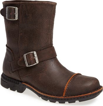 A casually rugged boot structured from water-resistant leather is styled with an exaggerated toe cap and two sturdy buckles. Genuine shearling lining wicks away moisture to keep feet dry.