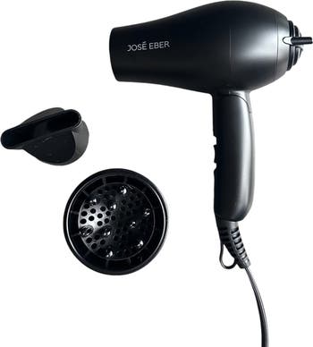 JOSE EBER: ULTRA MINI HAIR DRYER - Powerful performance and cutting-edge technology come together to deliver the perfect styling experience with the Jose Eber Ultra Mini Hair Dryer. Despite its compact design, this hair dryer offers colossal results that rival traditional, full-sized dryers. Fits in the palm of your hand! Measuring just 5.5 x 5.9 inches and weighing under 190 grams (less than half a pound), this is the world’s smallest and lightest hairdryer — offering exceptional portability without compromising on power. Whether you re traveling, heading to the gym, or simply need a space-saving tool for home, this foldable dryer fits effortlessly into any bag and guarantees fast, efficient styling on the go. The 1200-watt power ensures that even with its mini size, it delivers quick, effective drying for all hair types, leaving your locks looking smooth, sleek, and styled to perfection. Its foldable design is perfect for those who need both functionality and portability, providing convenience without the bulk of a traditional dryer. HOW TO USE: Unfold the hairdryer, plug it in and choose the desired speed/heat. After use, you can store the hairdryer in the storage pouch. KEY FEATURES: Super light weight with 190 grams, dual voltage for worldwide use, 5.5 x 5.9" - when folded only 5.5 x 3.7", removable filter for easy cleaning, nozzle included.