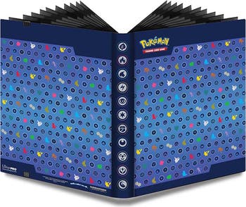 The 9-Pocket Full-View Pro Binder showcases a variety of Pokemon silhouettes on its cover. It contains 20 sheets, each capable of holding 18 cards, accommodating up to 360 cards in total. The side-loading pages feature black inner sheets. The embossed black web material in the middle provides a traditional framed appearance for the cards. The design of the side-loading pockets ensures cards remain securely in place. An elastic strap keeps the binder closed when not in use, and all materials are archival-safe, acid-free, and made without PVC.