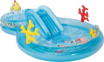 INTEX UNDER THE SEA INFLATABLE PLAY CENTER: WATER SLIDE - The INTEX Under The Sea Play Center is a great way to escape the summer heat! Simply attach a garden hose and discover a world of underwater inspired adventure and fun designs. Kids will enjoy staying cool as they splish and splash from the wading pool, to the main pool and escape down the water slide for added fun! Your child will enjoy the fun fish water sprayer and removable inflatable starfish for extra play! Bring some sunshine to your backyard and let your child explore the deep blue sea for endless hours of pool fun! Simply attach a garden hose and discover a world of underwater inspired adventure and fun designs. Kids will enjoy staying cool as they escape down the water slide. Features: Wading pool, main pool and water slide. Built-in sprayer attaches to garden hose. Landing mat for extra padding. Convenient drain plug. Repair patch included. Approximate water capacity: 77 gal (290L). Approximate inflated size 10ft 2in x 6ft 4in x 2ft 4in.