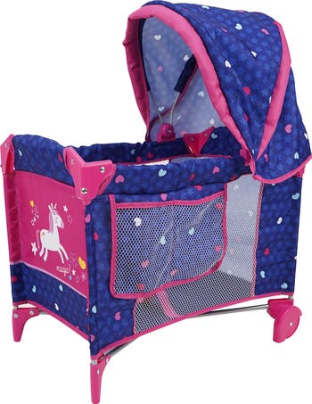 509’s Baby Doll Play Yard made with powder coated steel tube frame and thick durable polyester material. This cute Pack and Play includes some unique features like; removable multi position canopy, double side mesh pocket for accessories and real spinning back wheels for easy mobility. With Mesh on both sides, you can watch your Baby Doll Sleep or Play and it’s large enough to fit multiple Dolls. When it’s time for sleepovers the 509 Play Yard is perfect for travel, it folds up and fits into its own matching carry bag! This travel Play Yard will comfortably fit Dolls up to 18 inches. **Doll not included**.