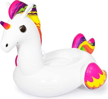 The Supersized Unicorn Rider from Bestway is a fun and fresh inflatable revamp of a timeless mythical creature. The inflated head, mane, tail and limbs carry vivid, rainbow-inspired color patterns. Each component is supersized to match the large frame and provide balance in the water. The robust handles serve as ride-on handgrips and make the float easy to maneuver in our out of the water. Outfitted with durable vinyl that’s stress tested, this float is built to last and a great addition to any pool party and lake trips. The included safety valves make inflation and deflation a breeze while regulating air pressure. A heavy-duty repair patch is included. Weight capacity of 198 pounds. Suitable for ages 10 and up. WARNING: CHOKING HAZARD -- Small parts. Not for children under 3 yrs. CAUTION: This is not a lifesaving device. Do not leave unattended while device is in use.