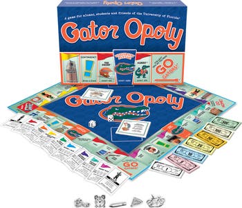 The Gatoropoly board game is perfect for UF alumni, students and future grads. Game includes alarm clock, pencil, gym shoe, bicycle and graduation cap tokens as well as popular campus and off-campus locations for board spaces such as tiger hall, student ghetto, Florida field and purple porpoise. It also includes relevant contingency cards.