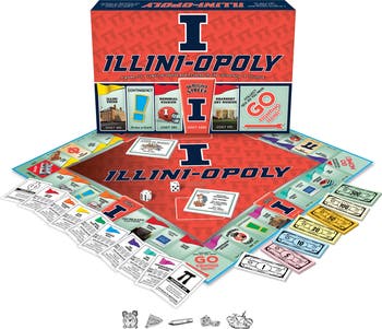 This ILLINIOPOLY board game is perfect for Illinois alumni, students and future grads. Game includes alarm clock, pencil, gym shoe, bicycle and graduation cap tokens as well as popular campus and off-campus locations for board spaces such as the quad, memorial stadium, Kam’s, papa del s, Illini grove and Wright street. Also includes relevant contingency cards.