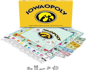 The IOWAOPOLY board game is an ideal choice for University of Iowa alumni, students, and future graduates. The tokens feature an alarm clock, pencil, gym shoe, bicycle, and graduation cap. The board spaces highlight notable locations such as Kinnick Stadium, South Johnson, Herky the Hawk, and the Iowa Memorial Union. Players can opt for traditional play or a one-hour version.