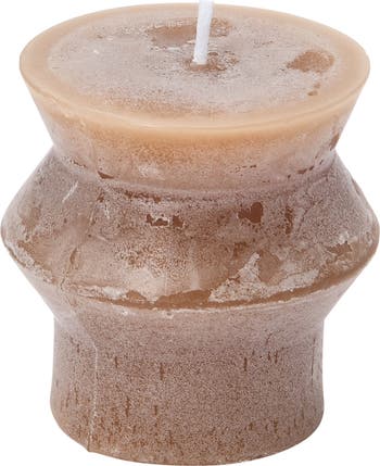 - This intricately carved pillar candle showcases a striking sculpturesque design