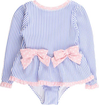 Seersucker Long Sleeve One Piece Bow Peplum Rash Guard Swimsuit is designed to keep your little girl protected while she plays under the sun. Featuring UPF 50+ sun protection, this swimsuit shields delicate skin from harmful rays, making it an essential piece for sunny days. The charming bow peplum adds a touch of whimsy, while the full seat coverage ensures she’s comfortable both in and out of the water. Crafted from seersucker fabric, this swimsuit is not only stylish but also durable with resistances to snagging and pilling, thanks to its 4-way stretch material. Perfect for young swimmers, this girls one piece swimsuit combines functionality with cute details like ruffle accents, making it a must-have for beach days and pool parties.