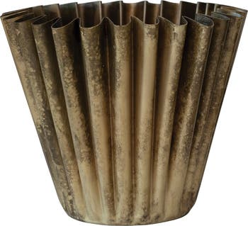 - A dramatic and striking planter that features a fluted metal surface with a brass finish and a distressed look