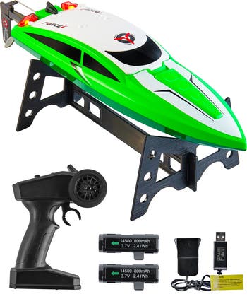 HIGH SPEED REMOTE CONTROLLED BOAT: The Force1 Velocity boat toy is a fast RC boat for adults and kids that races across pools and lakes. This rc speed boat has super cool features like underwater driving, low battery alert, and auto capsize recovery! Includes a 2.4GHz remote control transmitter with 100-meter signal range, 2 rechargeable boat batteries, and USB charger. RC BOAT FOR ADULTS AND KIDS: This remote controlled boat features low battery alarm, easy controls, a strong body for control over waves, capsize recovery mode to turn the boat upright if flipped, and high capacity battery for longer run time UNDERWATER DIVING AND DRIVING: Dive below the surface with this speedy mini rc boat! Its unique underwater driving feature allows for thrilling dives and aquatic adventures, bringing a whole new dimension to RC boating. Dive, drive, and discover the depths like never before! ADVANCED REMOTE CONTROL: Smart 2.4 GHZ boat remote control with dive button/power LED/trim adjustment/Left-Right direction/forward-reverse throttle, and low signal warning to avoid the boat going out of range (up to 328 feet) and the ability to race multiple boats at once! RECHARGEABLE RC BOAT: 10.85” Remote control speedboat includes (2) rechargeable 3.7 V 800mAh Lithium-Ion toy boat batteries, spanner, boat stand, remote control (requires 3 x AA size batteries - not included). Charge time 120 mins for 12 min play, for ages 8 and up DURABLE FRESHWATER BOATS: Race these durable remote control boats in rivers and lakes with low surface-debris or use as a pool boat in outdoor/indoor pools with liners; these boats are NOT for saltwater use SAFE AND SUITABLE FOR ALL AGES: Designed with user-friendly features and built-in safeguards, the Force1 Velocity Green is the perfect gift for both kids and adults, ensuring a memorable and secure RC boating experience