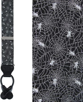 Daring, dramatic, and exquisitely detailed, the Venom Spider Web Braces are designed for the gentleman who commands attention with effortless sophistication. Woven from the finest silk, these braces combine refined craftmanship with a bold motif, an intricate lattice of silver-white spider webs and stylized spiders set against a rich black ground. The result is a striking design the balances gothic allure with timeless elegance. Crafted with button-end fastenings in genuine leather and polished nickel hardware, these braces offer a secure fit while elevating any ensemble with an air of luxury. Perfect for formal occasions, evenings of intrigue, or simply a conversation-starting detail, the Venom braces are more than an accessory, they are a statement of individuality. Braces are adjustable from 33 to 48 inches long and are 35mm or 1 3/8 inches wide.