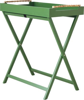- A versatile and stylish lacquered tray table with wood handles, finished in a vibrant green hue