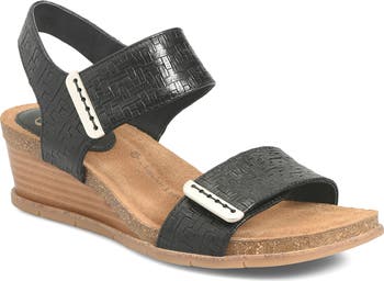 Adjustable straps offer comfort and customization on a woven leather sandal grounded by a suede-lined footbed and stacked wedge heel. Built-in cushioning and heel support provide lasting wear.
