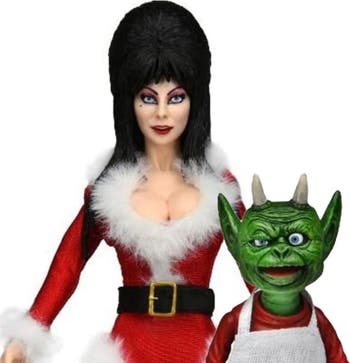 Very Scary Xmas Elvira 8" Clothed Action Figure by NECA. The devilishly delightful Cassandra Peterson has played the part of Elvira for more than 40 years with grace, humor and more than a little camp. NECA is proud to present this hauntingly holiday themed figure for your horror collection. This Deluxe Scary Xmas Elvira 8” action figure is fully articulated and features tailored fabric clothing, two interchangeable expressions, Bloody Mary, naughty list with quill, tray of gingerdead men cookies, and an articulated ‘Creature Who Was Stirring’ figure with tailored fabric apron, bowl, and spoon. Comes in window box packaging with slipcover.