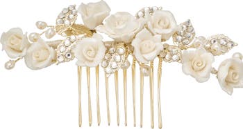 Intricately designed porcelain flower comb. Adorned in crystals for a timeless touch.
