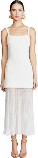 This dress combines a structured bodice with a sheer layered hem for a faux two-piece effect. The sleek knit body offers a figure-enhancing fit, while the airy pleated panel adds a touch of playful movement.