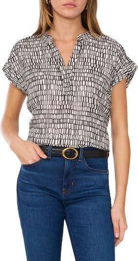 A curved hem lends tuck-in-or-out grace to a lightweight top marked by a jazzy print.