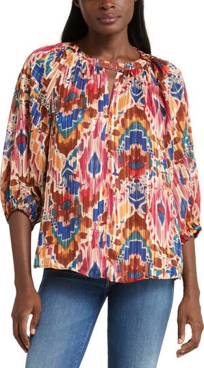 Transition seamlessly from desk to dinner in this balloon-sleeve top detailed with a playful keyhole at the chest and patterned with an ikat-inspired print.
