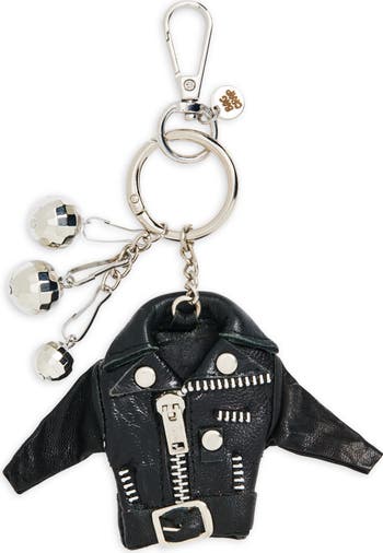 A vintage- 90s leather biker jacket scaled to comically tiny proportions and three detachable mini disco balls add the perfect blend of nostalgia and quirky attitude to this giftable bag charm.