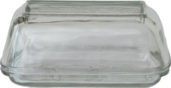 - An elegant, embossed glass butter dish with a lid, showcasing a clear, classic design that brings a touch of nostalgia to the table