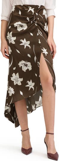 Step confidently into spring in this whimsical stretch silk midi skirt adorned with a bold vintage lily print. More to love about it? Cinching at the waist, an asymmetric hem, shirring detail, and a front slit feel fresh and flattering in featherlight silk. Style for any special spring occasion.