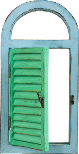 Complete a shabby chic living room or bathroom with an added pop of color. This window frame and shutter turned mirror is painted in bold cerulean and teal blues, then finished with a worn, weathered look to add a hint of vintage charm to your living space. Hang at the entryway to peek at before heading out the door, or use in a nursery for a charming, cottage accent.