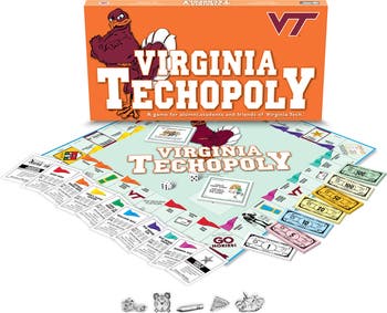 The VA TECHOPOLY board game is an ideal choice for Virginia Tech alumni, students, and future graduates. Game tokens feature an alarm clock, pencil, gym shoe, bicycle, and graduation cap. The board spaces are named after iconic university landmarks such as Burruss Hall, Newman Library, Lane Stadium, Cook s Laundromat, Hokie Bird, Drill Field, and College Avenue. Players can opt for traditional gameplay or a quicker one-hour version.