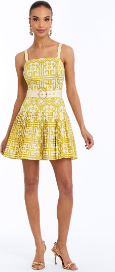 Drop waist mini dress with pleated tier skirt. Straight neckline with adjustable straps. Removable belt with gold hardware.