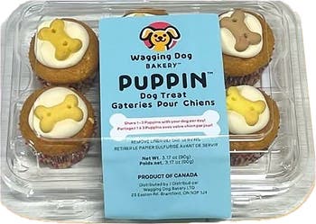 WAGGING DOG BAKERY S PUPPIN MINI CUPCAKE DOG TREAT - 6 PACK - At Wagging Dog Bakery, we are passionate about creating quality, nutritious treats that support the health and happiness of your furry companions. Our mission is rooted in the belief that dogs deserve the same care and quality in their snacks as we do in our own food. That’s why we use only natural, wholesome ingredients to craft delicious, tail-wagging goodies. Our Puppin Mini Cupcakes are a perfect example of this commitment. Specially developed just for dogs, these adorable treats are made entirely with human-safe ingredients, ensuring both safety and taste in every bite. Soft, flavorful, and fun-sized, Puppin Mini Cupcakes are the ideal way to celebrate your pup—whether it’s a special occasion or just a moment to show some extra love. With Puppin’s, every treat time becomes a joyful experience you and your dog can feel good about. Wagging Dog Bakery – where the treats are tail-wagging tasty! INGREDIENTS: Canola Oil (preserved with BHA and BHT), Dextrose, Oatmeal, Rye Flour, Dried Egg, Water, Dried Yogurt Powder, Sugar, Maltodextrin, Dried Whey, Glucose, Baking Powder, Mono- and Diglycerides of Edible Fats, Citric Acid (a preservative), Potassium Sorbate (a preservative), Potato Starch. GUARANTEED ANALYSIS: Protein (Min) 7%. Fat (Min) 16%. Fiber (Max) 1%. Moisture (Max) 19%. CALORIES PER PUPPIN: 54.
