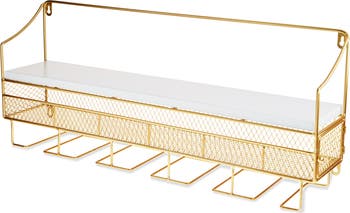 Display your wine and save counter space with this luxurious wall-mounted wine rack. This gold wine rack holds 8 bottles of wine, 5 wine glasses, and includes cork storage so you can save the memories of your favorite vintages.