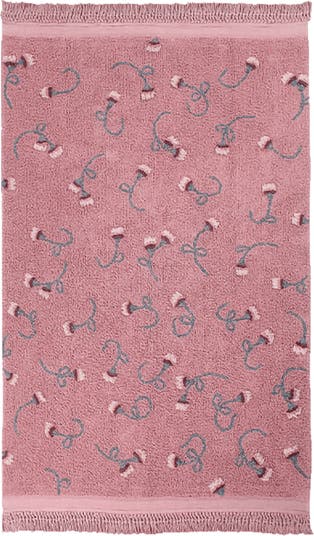 Washable rug in Ash Rose base color with all over flower design in soft colors. Visible canvas base at borders, finished with hand-knotted fringes