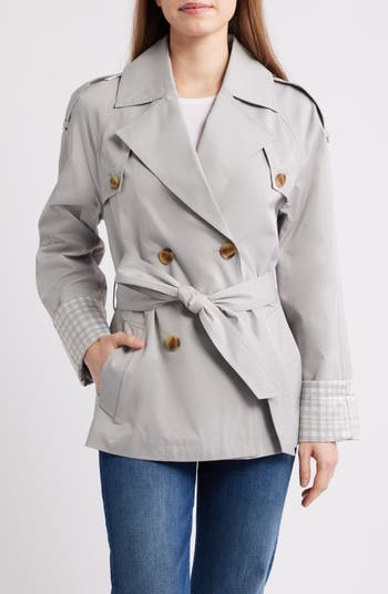 Make a drizzly day less dreary with an abbreviated trench coat offered with cheerfully checked sleeve cuffs.