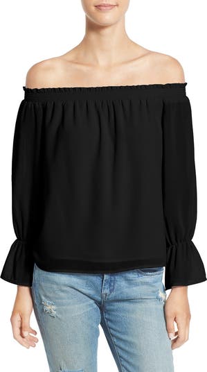 A smocked off-the-shoulder neckline and gathered bell sleeves add a sense of breezy romance to a trend-right off-the-shoulder top in a floaty silhouette.