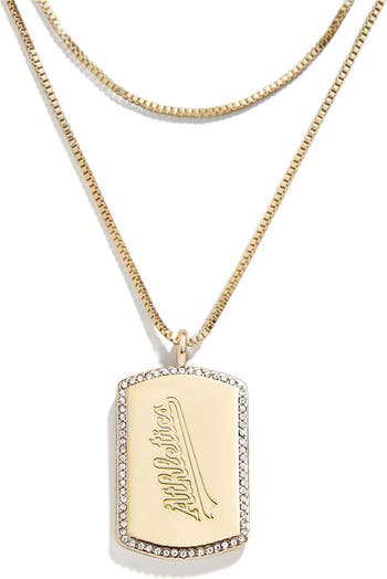 Make your team spirit sparkle and shine with this Oakland Athletics Dog Tag necklace. BaubleBar and WEAR by Erin Andrews collaborated to create this layered set featuring debossed details on both sides of the dog tag pendant and shimmering embellishments. A lobster claw clasp ensures this Oakland Athletics necklace fits just right.